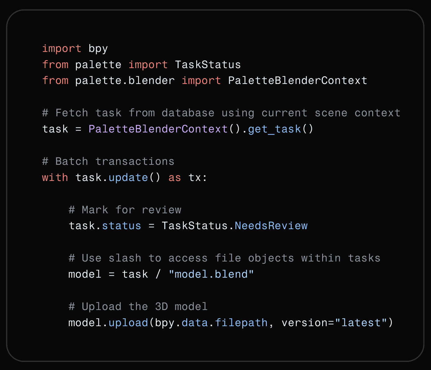 import bpy from palette import TaskStatus from palette.blender import PaletteBlenderContext # Fetch task from database using current scene context task = PaletteBlenderContext().get_task() # Batch transactions with task.update() as tx: # Mark for review task.status = TaskStatus.NeedsReview # Use slash to access file objects within tasks model = task / "model.blend" # Upload the 3D model model.upload(bpy.data.filepath, version="latest")